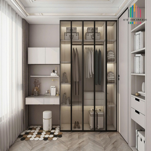 ♦ Phụ kiện: Thanh treo quần áo INOX, ray bi kéo, bản lê giảm chấn, ổ khóa hộc tủ âm, 2 chìa khóa, đèn LED