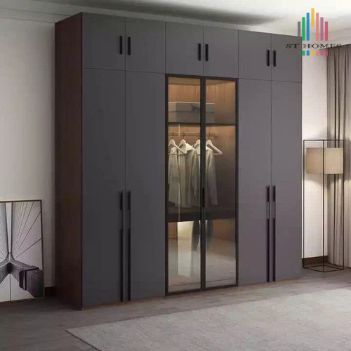 ♦ Phụ kiện: Thanh treo quần áo INOX, ray bi kéo, bản lê giảm chấn, ổ khóa hộc tủ âm, 2 chìa khóa, đèn LED